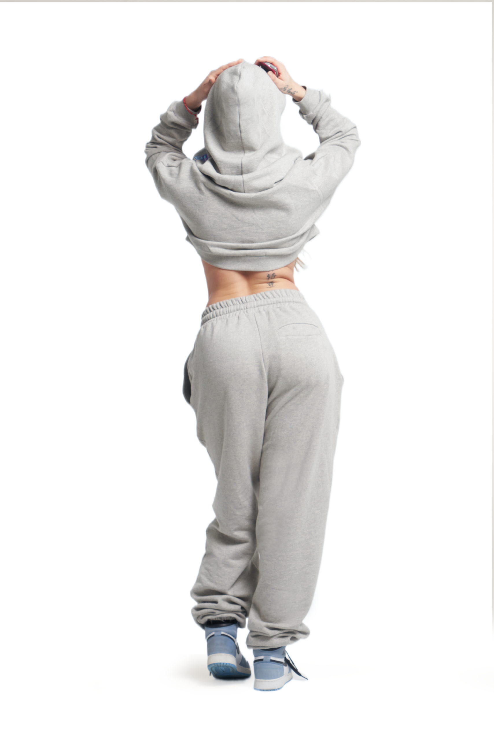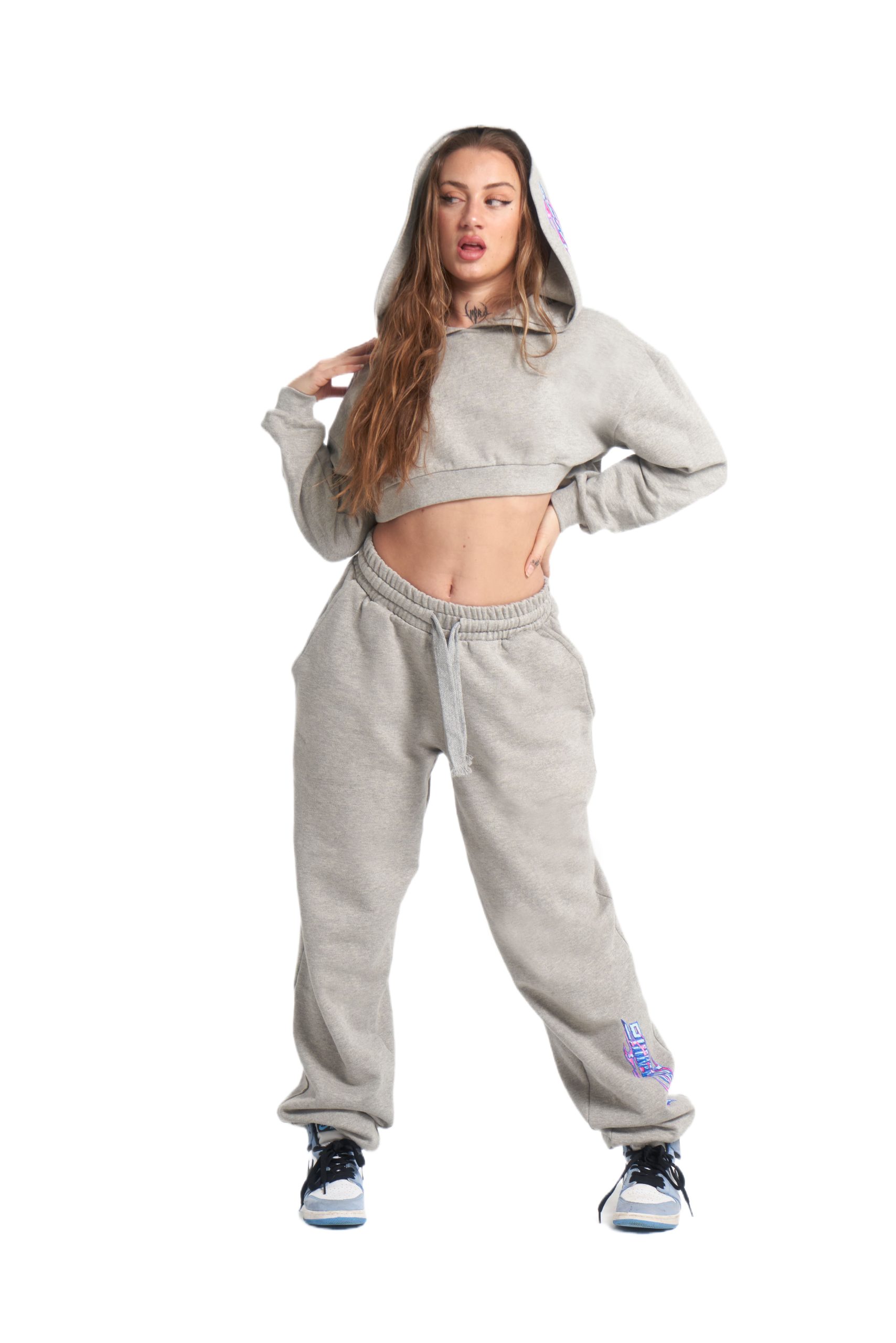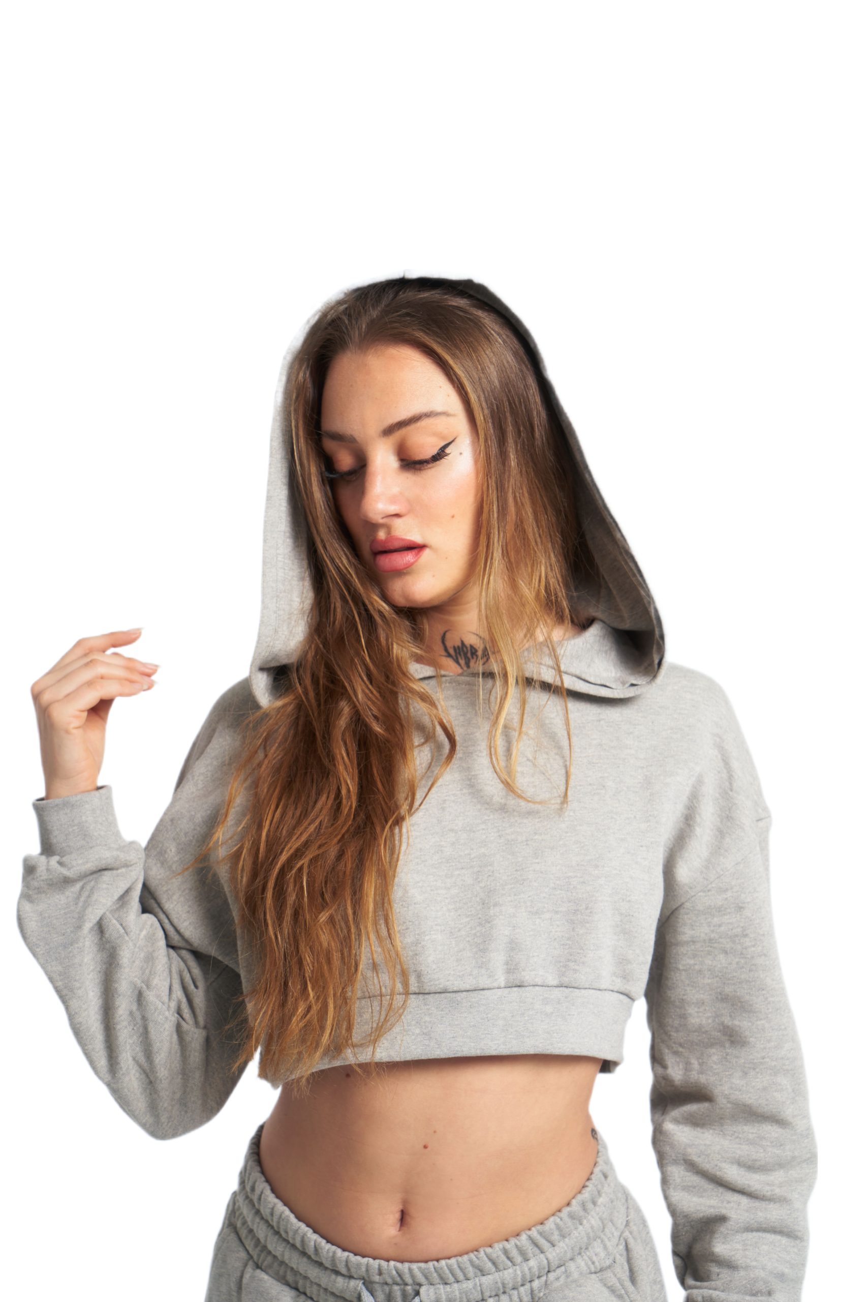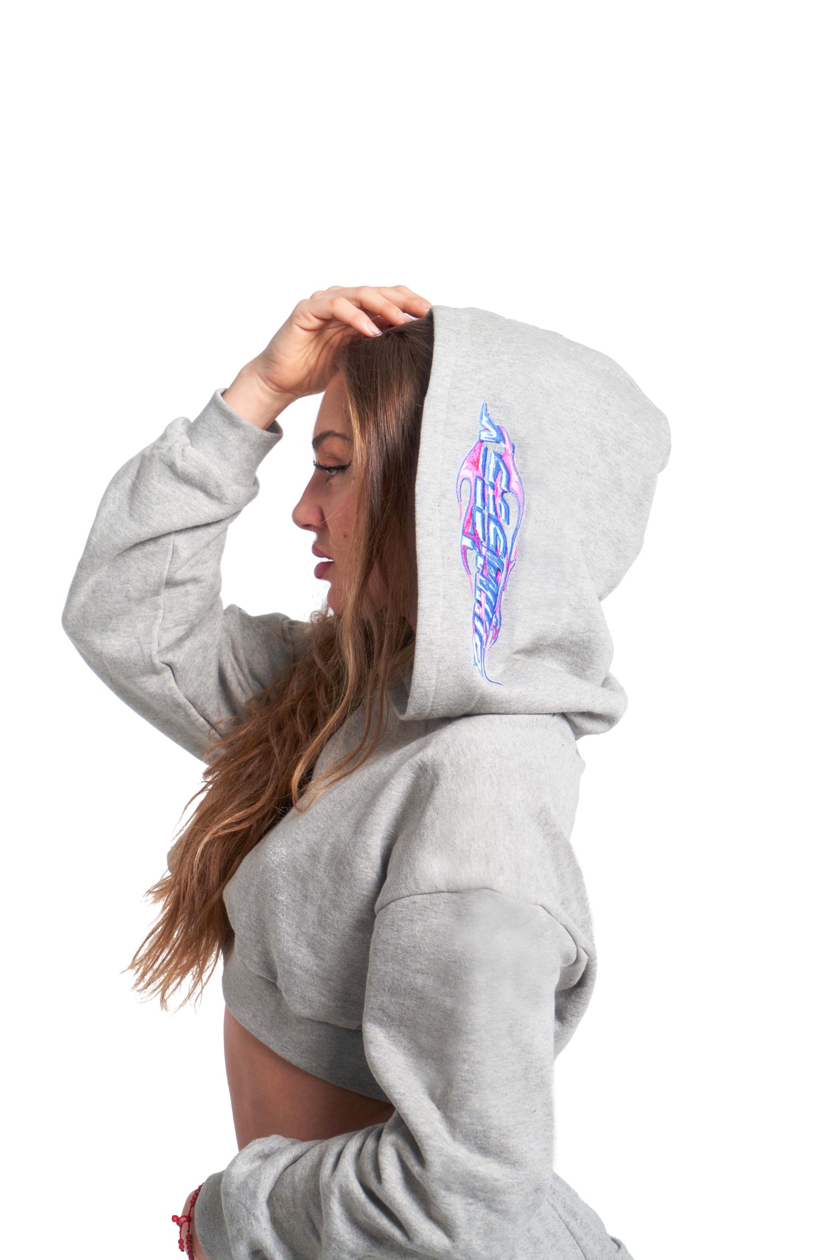Sudadera gris de corte crop fabricada en España con la mejor calidad. Es súper elástica para un ajuste cómodo en cualquier ocasión. El logo está serigrafiado en el lateral de la capucha. ¡Una pieza imprescindible en tu armario!